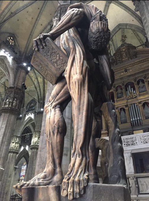 with anatomical exactitude, influenced by Vesalian studies of the opened, exposed human body. Michaelangelo achieved something similar in 1536 in his wall painting in the Sistine Chapel, but his Bartholomew is resurrected in the flesh at the Last Judgment, clutching his...