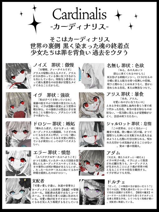 罪人達の魂が堕ちる世界「カーディナリス」と、カーディナリスを管理する上位世界「楽園」。2つの世界に住まう少女達の物語。罪に染まった魂は、輪廻転生の輪を外れ、その場所で永遠の安寧を得る。ようこそ、悪夢の世界へ。