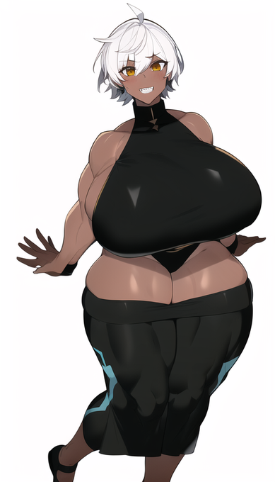 1girl,full body,short hair,white hair,thick,huge breasts,last origin,dark skin,hyper muscle,jagged teeth