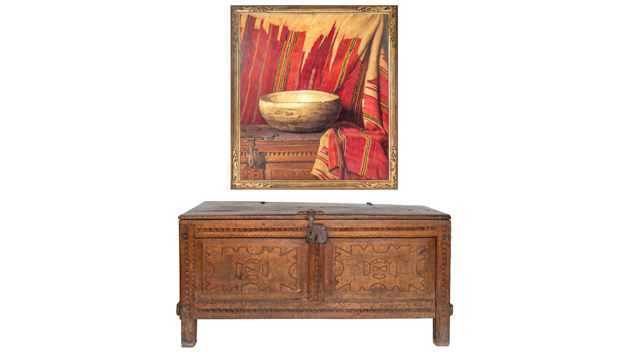 A '35 still life oil painting by Joseph Henry Sharp along w/ a Spanish Colonial chip carved chest brought $335K @ Shapiro Auctions’ Jul 25 sale... Click for details.