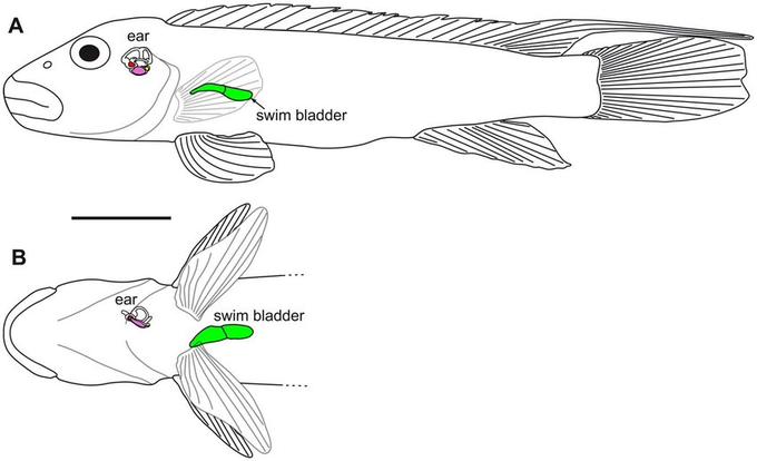 左はハゼじゃないけど同じ底層生活の魚で体の構造は近い。浮袋は小さく前方寄り。右は中層生活する魚で浮袋(緑色)が大きく、そして体の重心と浮力中心が近いように設計されている。進化の不思議で、どちらもシクリッドの仲間。 https://t.co/ALBzWa2uKA