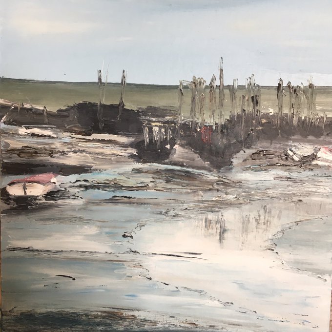 ‘Tide is out’ Morston creek oil on board now drying on my easel and available to buy framed in white wood £155 (30cm x30cm) please message me here or visit my website https://t.co/s4cqaZhqmr thankyou #tide #creek #morston #mud #lastjetties #coastart #light #norfolkcoast