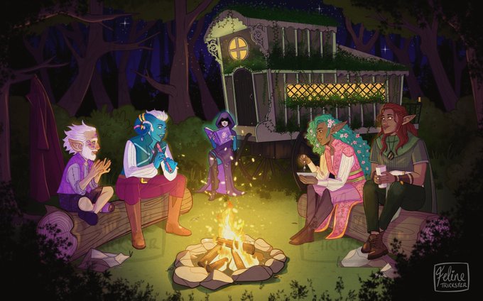 @GabeJamesGames Pretty proud of this illustration I did, a party gathered around the campfire! And I've been obsessively drawing my Paladin Freya in my spare time 💜