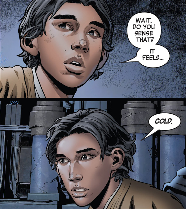 10. Young Rey and Ben share a similar moment sensing a similar feeling. From The Rise of Kylo Ren, Ben senses Ren (the original master of the Knights of Ren) and Rey senses Ben's fall to the dark side.