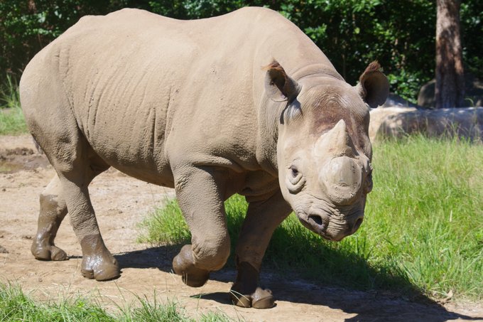 #シロサイ (No.94) 大きな角と身体が迫力満点の獣。サイやゾウはその大きさのせいか、歩いているだけでも目を惹かれますね。珍しく口を開けた写真があったのでイラストのモデルにしました。