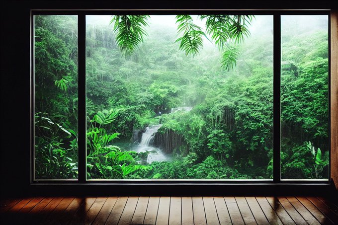 熱帯雨林と滝を望む屋敷