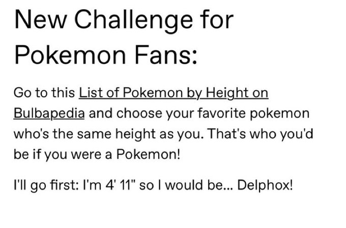 There is NO 5’2 Pokémon so I said fuck it idc my fav Pokémon is 4’11 anyways so I’m choosing that instead https://t.co/SSwndFHpfH