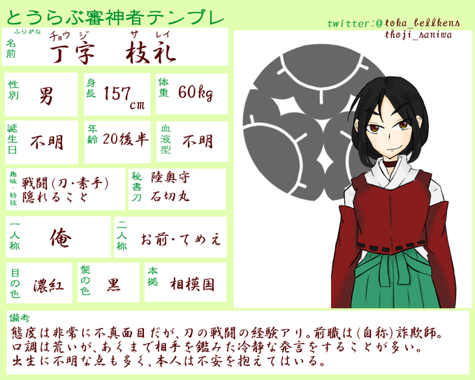 審神者のテンプレお借りしました。 さっき書きあげたので、うちの審神者のプロフ作ったぜ。こいつは【@thoji_saniwa】の方で動かしていこうと思います。