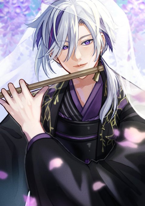 藤の花の下、笛の音を奏でてる不破湊 (手前背景有り無し差分) #にじライバーの野望資料集 #絵スコート