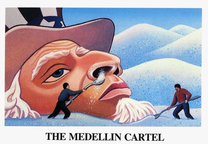 One notable partnership in Latin America was the Medellin Cartel (Card 11) led by Pablo Escobar. The card shows both men shoveling cocaine up the giant head of Uncle Sam. The CIA turned the other way to the cartel’s activities, and Escobar gave $10 million to the Contras.