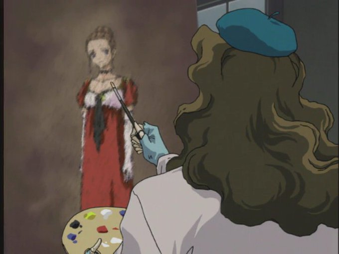 強制的に着替え→捕えられ怯える表情→淡々と笑顔の被害者の絵を描く→理想の表情とポーズのまま絵に