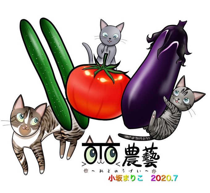 農家さんからご依頼のイラスト、夏野菜バージョン🎶みなさんお野菜しっかり食べて、これからの暑い夏を乗り越えましょう💪新型コロナに負けないように、体力&免疫つけましょう💪 #小坂まりこ #漫画家 #漫画 #イラスト #猫 #野菜 #農業 #OTO農藝 #ポップ #なす #トマト #きゅうり #夏野菜