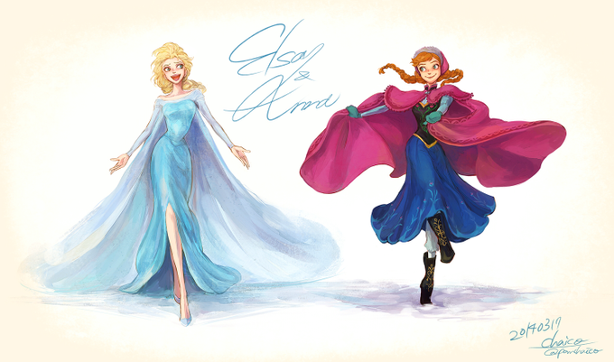 エルサとアナ。先日の線画に色塗りました。ツイッターだと縮小されるので、こちらに大きいサイズのものを置いてます http://t.co/LfsDDSRuLh