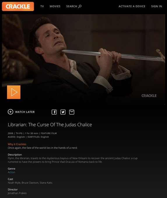 *Also* also “The Librarian III:The Curse of the Judas Chalice” is available via Crackle (https://t.co/ClhgjijVq7) and whatever Plex is (https://t.co/nF2TnkUKgy)