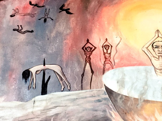 地獄釜では男女の亡者が煮られている。しかし彼らはまるで混浴を満喫しているかのようにはしゃいでいて、とても苦しんでいるようには見えない。そして地獄釜の奥には串刺しの亡者や影だけの亡者がいる。影だけの亡者の一人はよく見ると耳が尖っていた。#タイの地獄寺