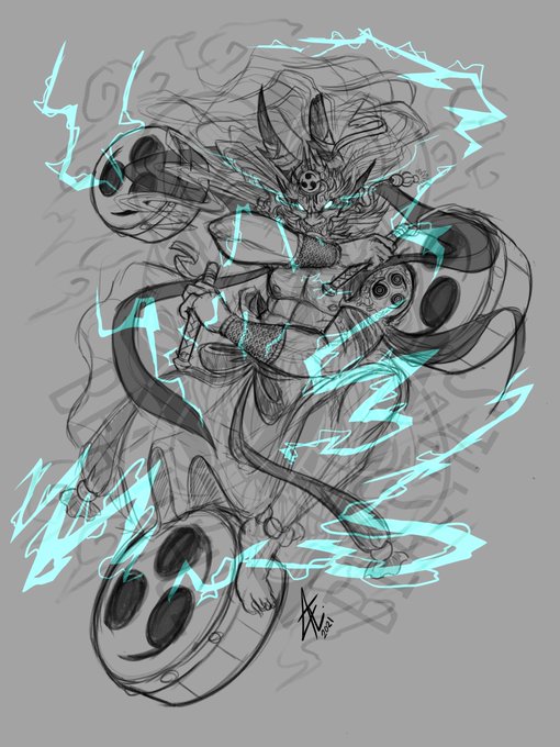 Finished line art for a Raijin #Commission along with the three concept design sketches. ⚡️👹⚡️#雷神 #rkgk