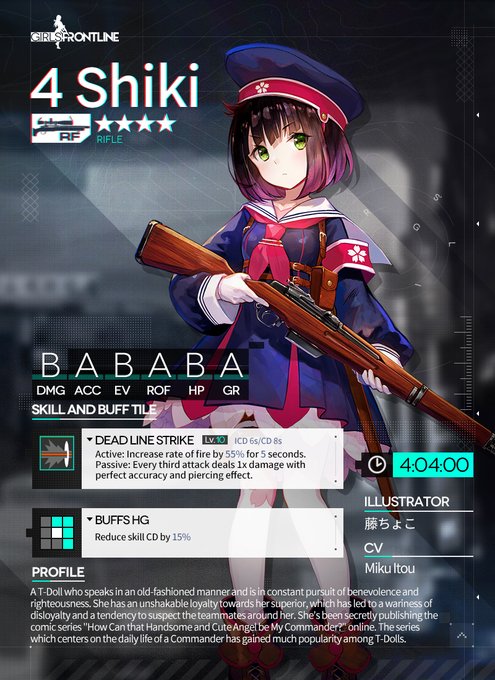Today we are bringing you a preview of 4 Shiki, the 4-star RF T-Doll that will be added to the production pool on Mar. 17th! This is a girl with shining eyes and a loyal heart! Will you be worthy of her unfaltering trust?