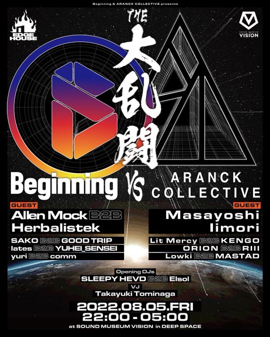 Beginning & ARANCK Collectiveが繰り広げるDEEP SPACEはMasayoshi Iimori, Allen Mock x Herbalistekをゲストに招き、両チームがJapanese Bass Music の存在感を見せるまさに一夜限りの大乱闘のDJセットが演出される。勝敗は当日ご覧あれ!