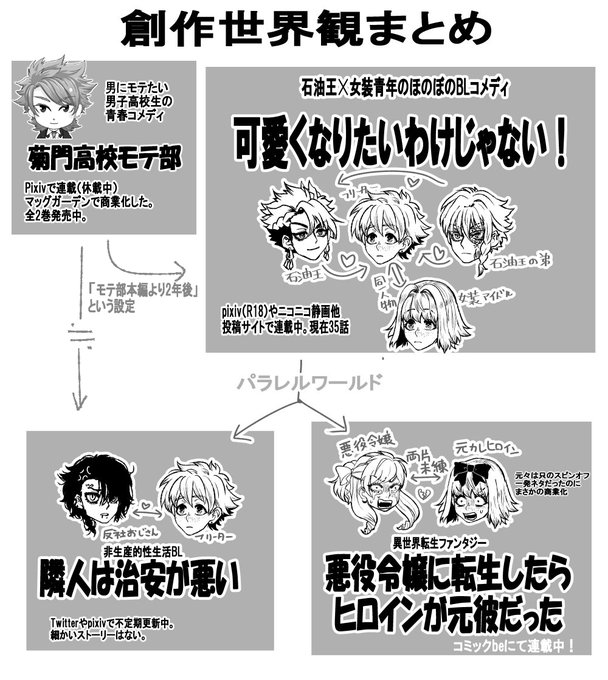 石油王×女装アイドルの創作BL「可愛くなりたいわけじゃない!」とそのセルフ二次創作「隣人は治安が悪い」をpixiv他投稿サイトで、スピンオフ「悪役令嬢に転生したらヒロインが元彼だった」を雑誌コミックbeにて連載しています