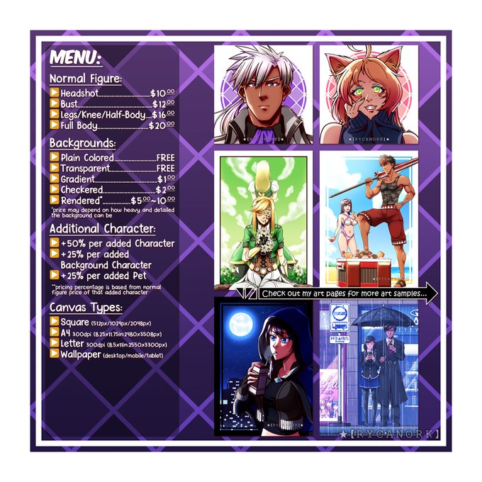 Hello there! I'm open for art commissions! If interested, please message me on Twitter, Facebook, or Discord (RYCANORK#8234). 🎨