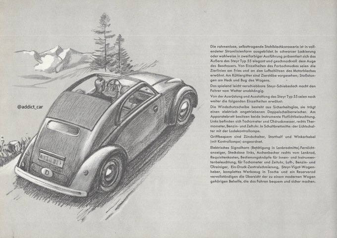 I don't usually collect pre-WW2 brochures but here's an exception. The streamlined 'Baby' Steyr Typ 55 was a 4-seater well ahead of its time. Born amid the darkest of times for Austria, it debuted as the 50 in 1936 before this improved version arrived in 1938. #carbrochure #Steyr