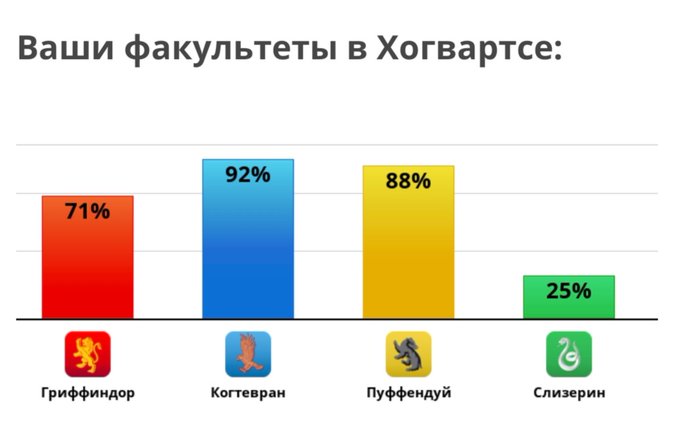 Пуффендуй и Когтевран примерно на одном уровне,но Барсуки прегнали Орлов на 5 процентов! https://t.co/DRI5VaOhMt