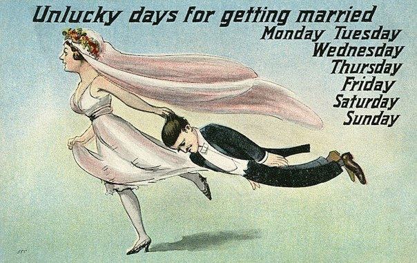 Неудачные дни для женитьбы: понедельник, вторник, среда, четверг, пятница, суббота и воскресенье - английская открытка начала XX века.