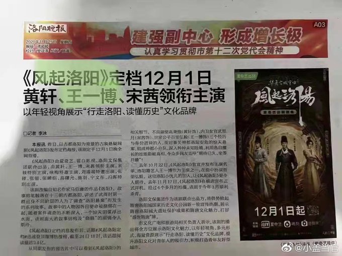#ตำนานลั่วหยาง มีลงข่าวในหนังสือพิมพ์ด้วย นสพ ของเมืองลั่วหยาง เหอหนาน เขียนพาดหัวใหญ่ๆ ว่าซีรีส์ลั่วหยางจะออนแอร์แล้ว 1 ธค นี้ นำแสดงโดยหวงเซวียน หวังอี้ป๋อ วิคตอเรีย แล้วลงรายละเอียดที่มาและแนวเรื่องยาวมากเลยพร้อมโปสเตอร์