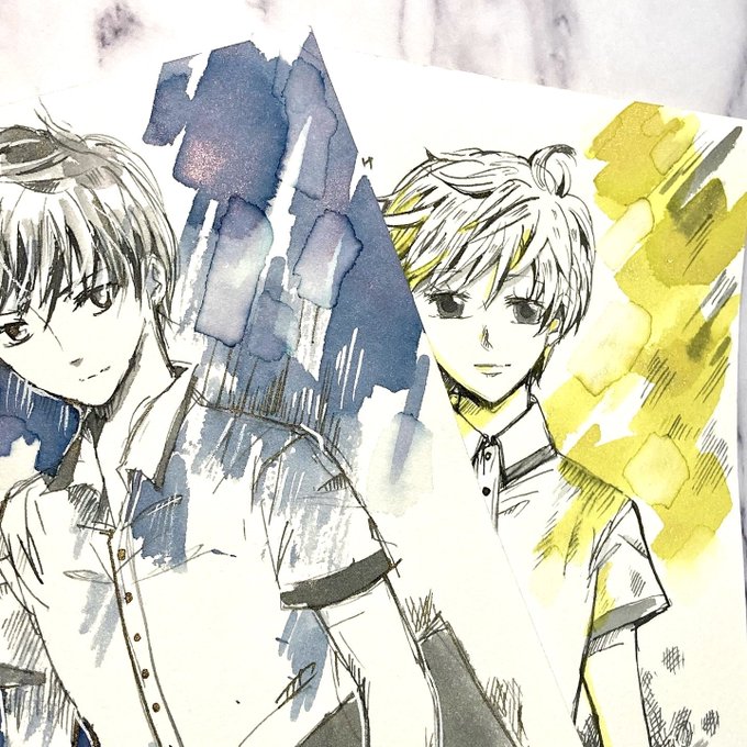 ライブでお話をさせて頂きました「影に別のインクを置く」という話ですが、こちらの絵が参考となっています。一番影になっている部分は上から別の色のインクを重ねています。メインインクは静寂で影は群雨です。インク→あめこさめさん【@komono_ame 】