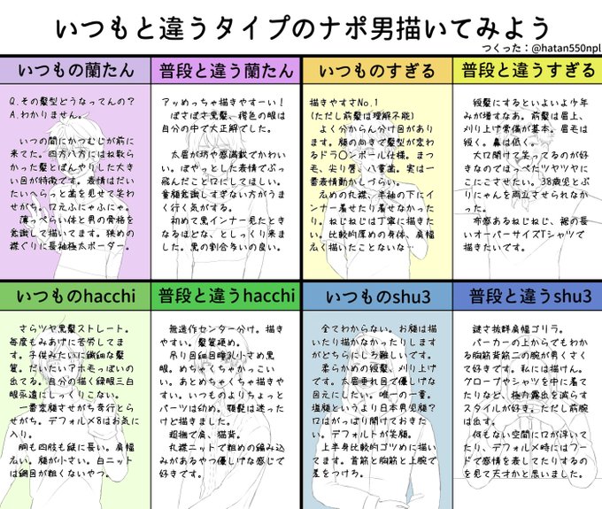 #いつもと違うタイプのナポ男描いてみよう 素敵なテンプレをお借りしました! 人によって違うfaの描き方見比べるのだいすきなのでとってもありがたい…