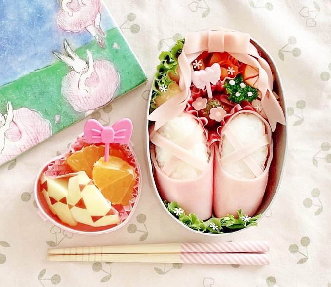 娘がバレエシューズのお弁当をもう一度とリクエストしてくれたので、前回より絵本にちなんだパーツを増やしました🌸
