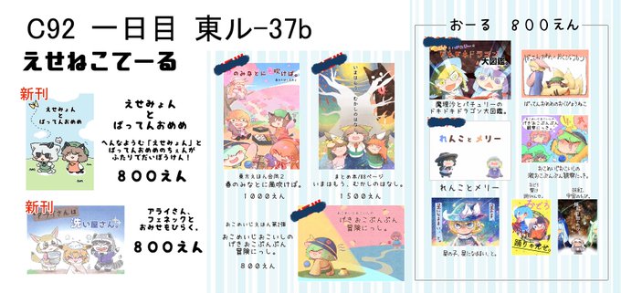 おっそくなりましたがおしながきです。雑でごめんなさいみ。新刊はへんな妖夢ちゃん「えせみょん」とばってんおめめなちぇんちゃんがふたりで冒険するおはなし!ジャパケ新刊のけもフレ絵本、アラフェネアクキーもあるよ!楽しい絵本がいっぱいのえせねこてーるに是非きてね!ル37bで待ってるっ!