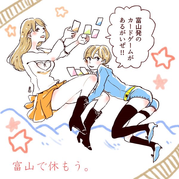 というわけで今日の一枚! #富山で休もう おんせんがぁるず×えだせんがぁるずリスペクト。 富山発のカードゲームがあるがいちゃ! 応援色紙も描きましたので皆様ぜひ法林寺温泉さんへ行こまいけ~。 28日(日)は大会も! #絵