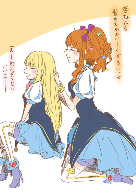 デレマスローディング中の杏きらをみて。杏が衣装着るとき三つ編みなのはきらりがやってたら可愛いなぁーと思って。そして1期OPのハートの髪飾りはお揃いにしよっ♪ってきらりが無理やりつけてたらいいなー。