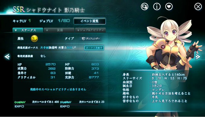 #X_Overd かげのん…もとい影乃騎士。雷属性のディフェンダー。人を挑発するの好き(?)だからある意味適役?w 速さ83ってメアリーと同じ…戦力的には雷属性のメアリーって捉えてもイイかも?