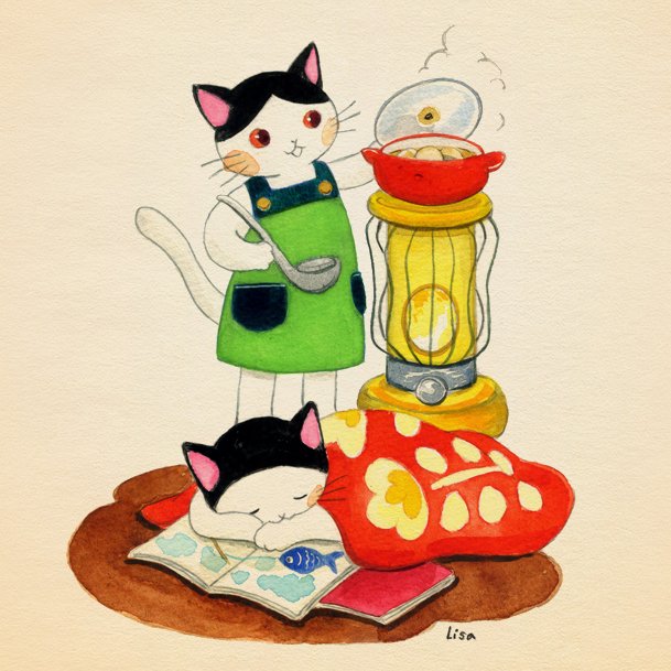 はちわれねこと かつらねこ あったかすとーぶ うれしいな おなべのなかは おでんぐつぐつ はやく いっしょに たべたいな♪ #イラスト #水彩 #ねこ