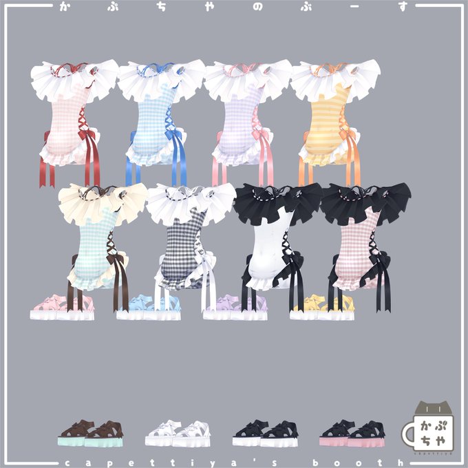 新作のフリルワンピース水着のからーばりえーしょん! 今回はpsdにて全色 ・無地 ・ギンガムチェック ・ボーダー から選べます!(pngで書き出してある柄は画像のとおりです) あとTシャツが絶妙に透けるマテリアルも同梱予定! #かぷちや水着