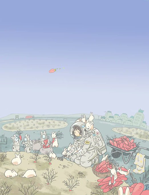 宇宙でうさぎと暮らしてるシリーズで新しく描きました🌝🐰(画像は過去のもの)今回は水彩で描いてます。