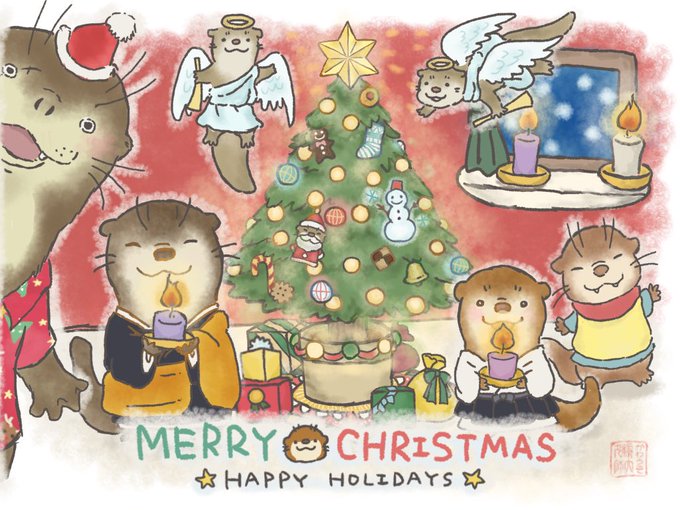 メリクリイブ!去年ので申し訳ないのですが、カワウソたちのクリスマスカードをどうぞ! (去年アドベントカレンダー風に毎日クリスマスの絵を描いたのよ!) #メリークリスマス #カワウソ #かわうそウソ大師 #お絵かき