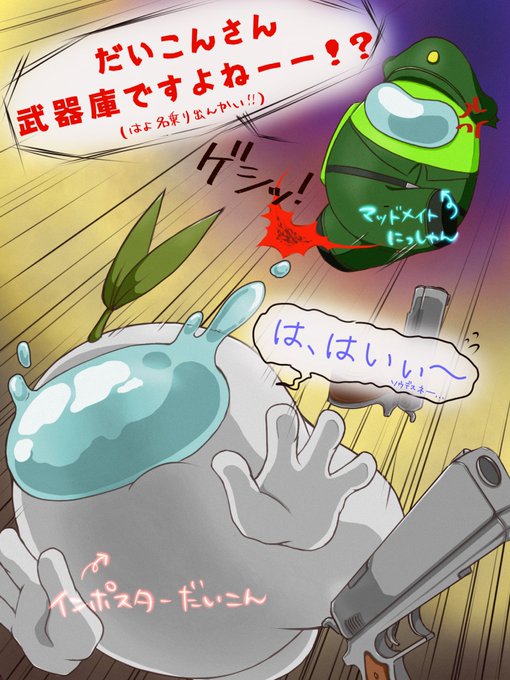 昨日の試合の一幕 アドミン情報で詰められそうなインポスターを位置情報の乗っ取りを指示して救おうとするマッドメイトの図 #AmongUs #AmongUsFanart #くあてぃ船