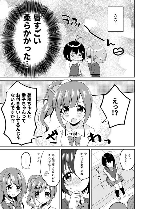 CuFES新刊のこひさちみほさち本のサンプルです~ 付き合う前にキスしちゃった小日向ちゃんと幸子が空回りするお話です😘 #CuFES02 #はにエモ2