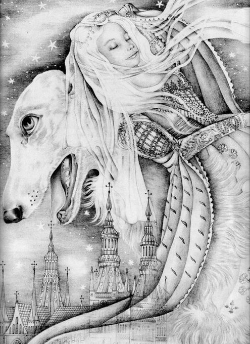 神話とか伝承とか宗教とかを描いてる人らしいです。みっしりした描き込みとか重さがあるのに浮揚感もあるところとか、羽根の使い方とか大好き