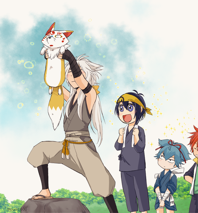 #こんのすけと刀剣男士 なんだかんだ男士と仲良くやってるこんちゃん 4枚目は初期刀に極が実装される前に描いたらくがきです😂