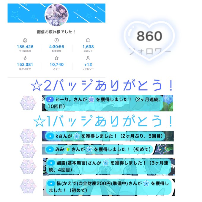ペンデさん!リブラさん!しおたさん!たぁちゃん!おふちゃ!えるちゃ!れあたん!バッジ取ってくれてありがとうー💕💕