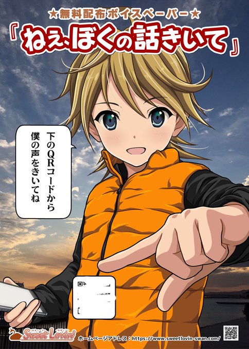 シェア希望です😃明日のコミケ『GP娘』様で『SweetLovin'・すうぃーとらびん』の無料ボイスペーパーを置いて頂きます。この少年も #P2W さんが描いて下さってます❣️白く消してる四角の所がQRコード。ここから音声3種類聴いて頂けます。初の試みです✨💛