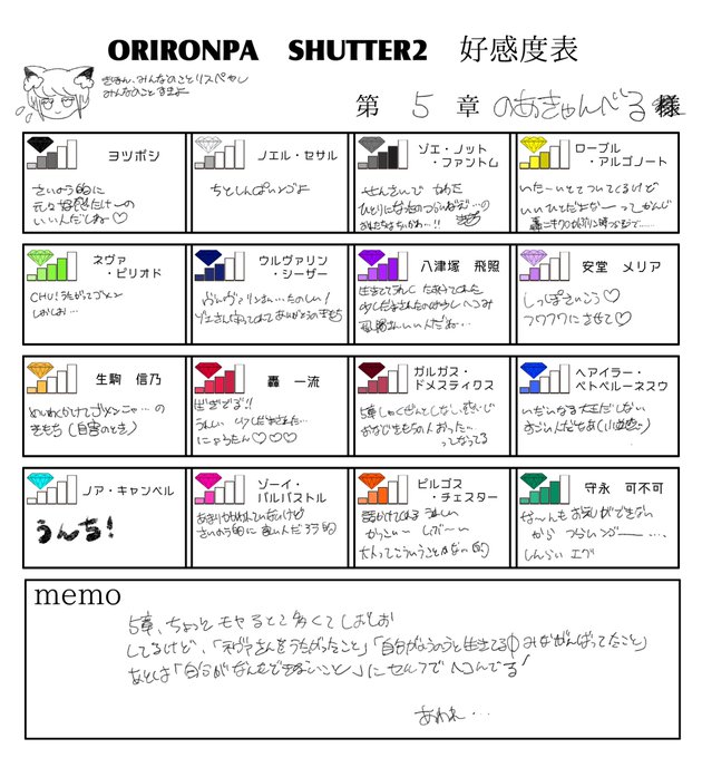 二枚目は自己嫌悪でベトベトに凹んでた頃の好感度表だぞ ここから上がっていたりするのもあるけど下がることはね、ないんだぜ(最終的なもの今度載せたいかも)