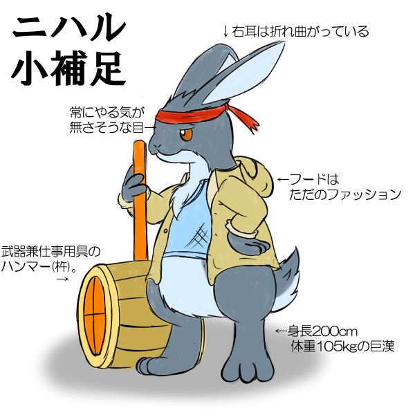 あと人間ぐらい脚が長いキャラも不得手なので獣人と言えるキャラとなるとこのでかウサギのニハルぐらいしかいない。ハンマーで相手を殴ることで治癒魔法をかけるという謎能力の持ち主。ドラード城の炊事要員の一人で本職は餅屋。 #ドラード城キャラ図鑑