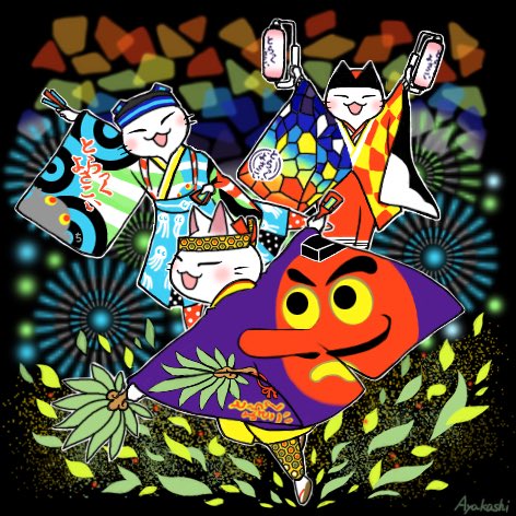 昨年、とらよさ&ほにや&上町のイラストを描いたときにほめて下さった太朗さん。天国支部から大扇子をふっている姿を描かせていただきました。