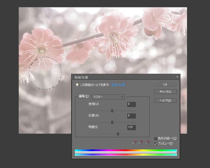 「フォトショ」選択ブラシツールで〇にして、そこをそのまま明度上げれば玉ボケ風になると気づく。