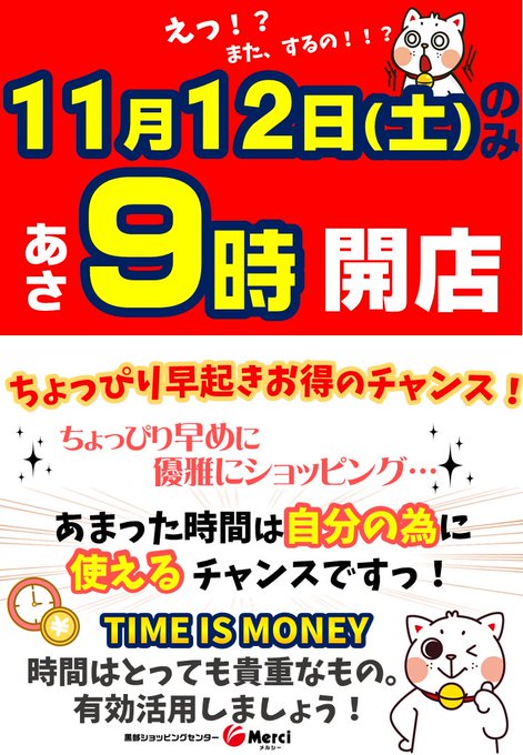 なんだかお休みを逃した気分の皆さん、メルシーは朝9時30分開店~オトクマシマシでご来店をお待ちしております